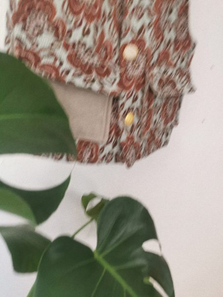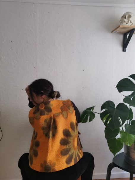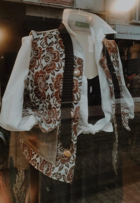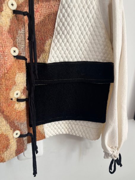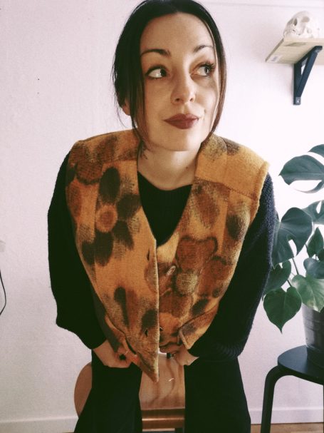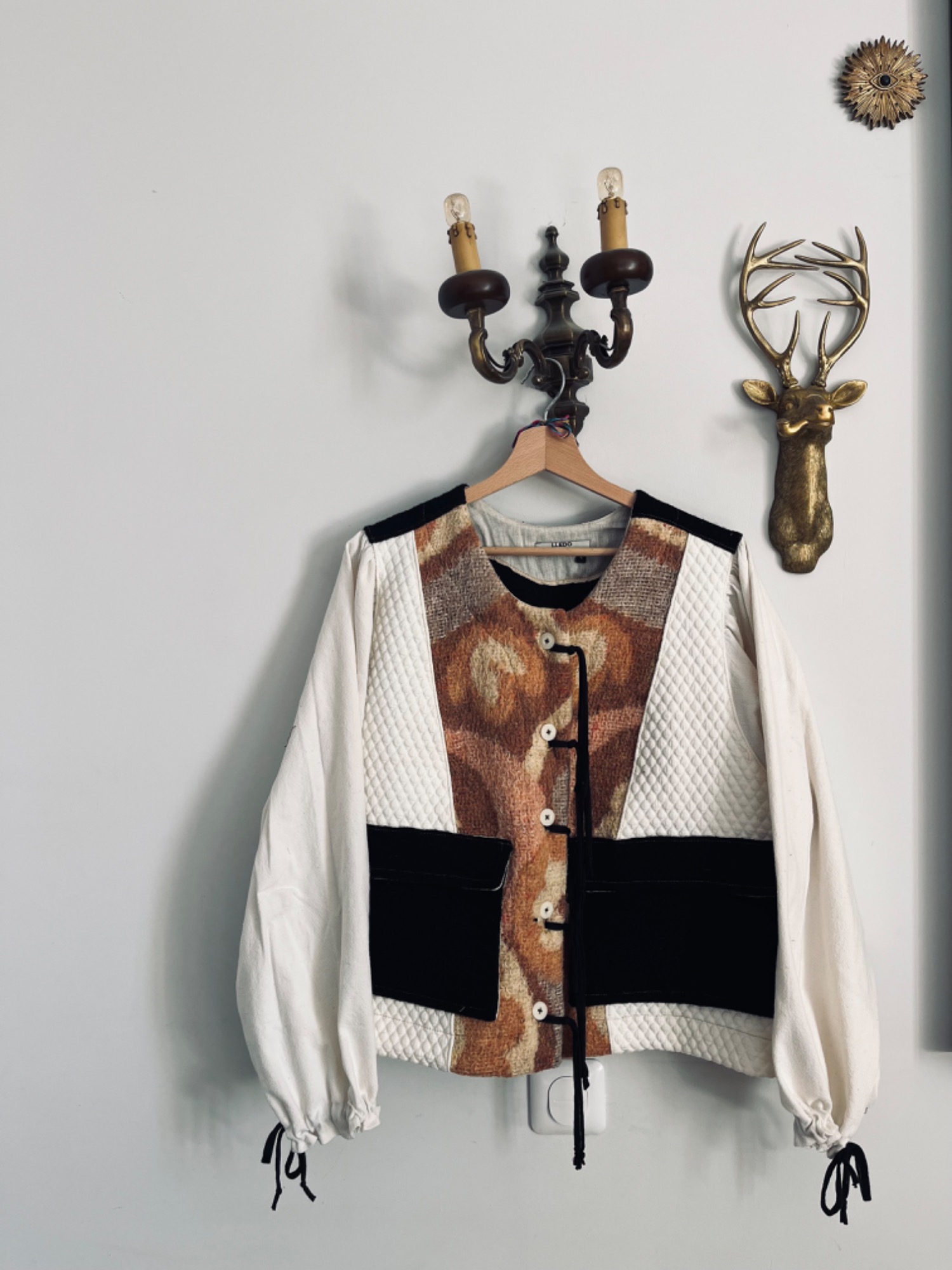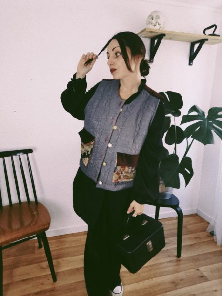Imaginé à la suite d'une balade en famille à la Sainte Beaume, direction la grotte de Marie-Madeleine. J'y ai croisé une belle dame, très agée, au look inspirant façon Indiana Jones. Elle portait un gilet semblable à ceux des pêcheurs, large et pratique avec de nombreuses poches.Dès mon retour, j'ai chiné des couvertures et tissus d'ameublement pour y couper les futurs gilets... qui ont eu grand succès, de Grenoble à Forcalquier.